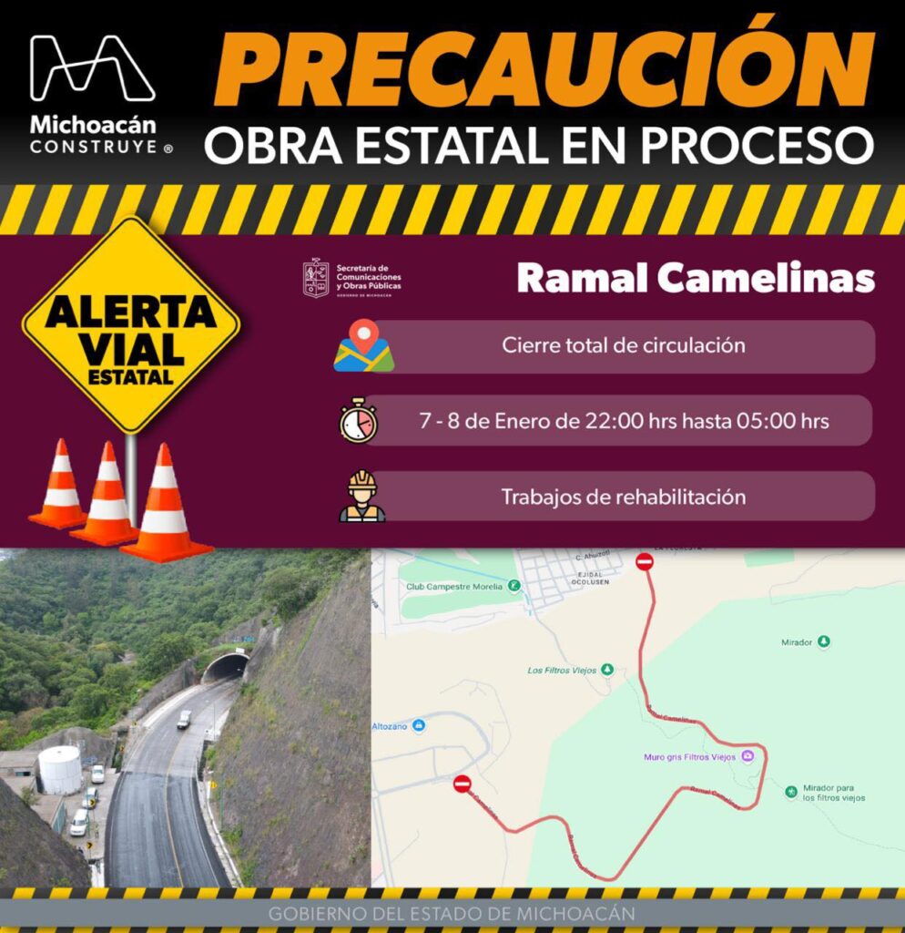 07 Enero 2026. Morelia, Michoacán.- La Secretaría de Comunicaciones y Obras Públicas (SCOP) de Michoacán informó que el Ramal Camelinas permanecerá cerrado durante las noches del 7 y 8 de enero, debido a trabajos nocturnos de rehabilitación.