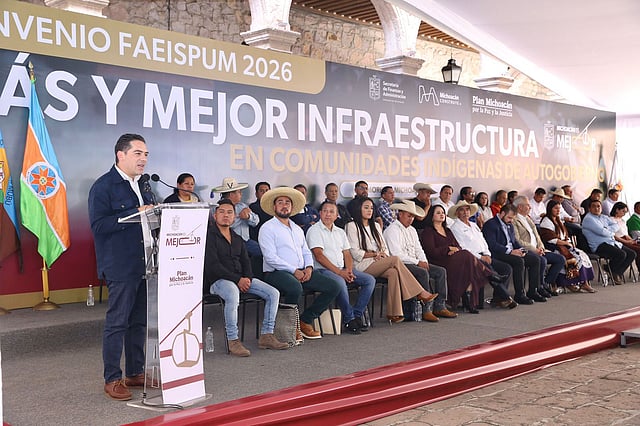 24 Marzo 2026. Morelia, Michoacán.- Este año, todas las comunidades indígenas con autogobierno de Michoacán accederán a recursos para la construcción de obras públicas en beneficio directo de sus habitantes, comprometió el gobernador Alfredo Ramírez Bedolla al firmar el convenio del Fondo de Aportaciones Estatales para la Infraestructura de los Servicios Públicos Municipales (Faeispum) con las primeras 29 comunidades que se rigen por usos y costumbres.